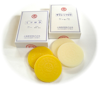 ミツバチの巣は働き蜂が腹部から分泌する 蝋成分が主な構成材料となっています。 この巣から得た蝋を精製したものがミツロウで、 更に漂白したものがサラシミツロウです。 巣から採取された蝋は花粉や色素などの不純物を 非常に多く含んでいるため、黄土色をしており そのままの状態では使用に供さず、 溶解して不純物を除去し、脱臭、脱色などの精製工程を経て グレードの高い製品へ仕上がります。 |