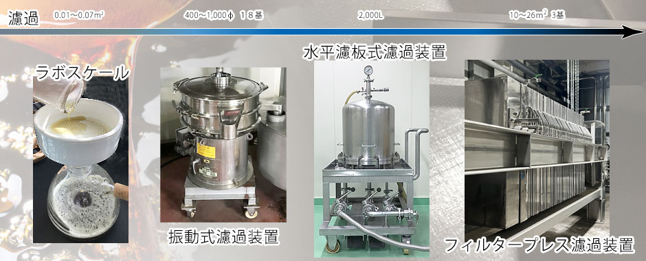 お預りする原料の抽出から乾燥までのエキス加工をはじめとして、有機溶媒やカラムによる目的物質の精製、中間原料からの2次加工、スプレードライ(噴霧乾燥)など、お客様の多様なニーズにお応えします。当社工場には危険物製造所を有しており、抽出や精製工程ではエタノールなど様々な有機溶媒の使用が可能です。
