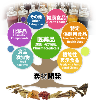 医薬品、健康食品、化粧品などジャンルに応じた多彩な製造ノウハウを有しております。日局や局外生規、外原規などの公定書に適合したエキスの生産も可能です。その他、お客様のご要望に応じて、新たな素材開発にもご協力致します。