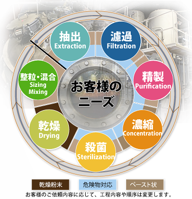 当社は天然物の抽出メーカーとして長年培ってきた経験と最新鋭の生産設備を活かして、幅広い受託加工事業を展開しています。 |