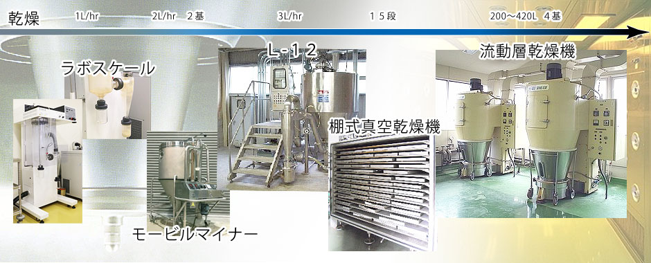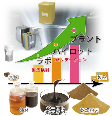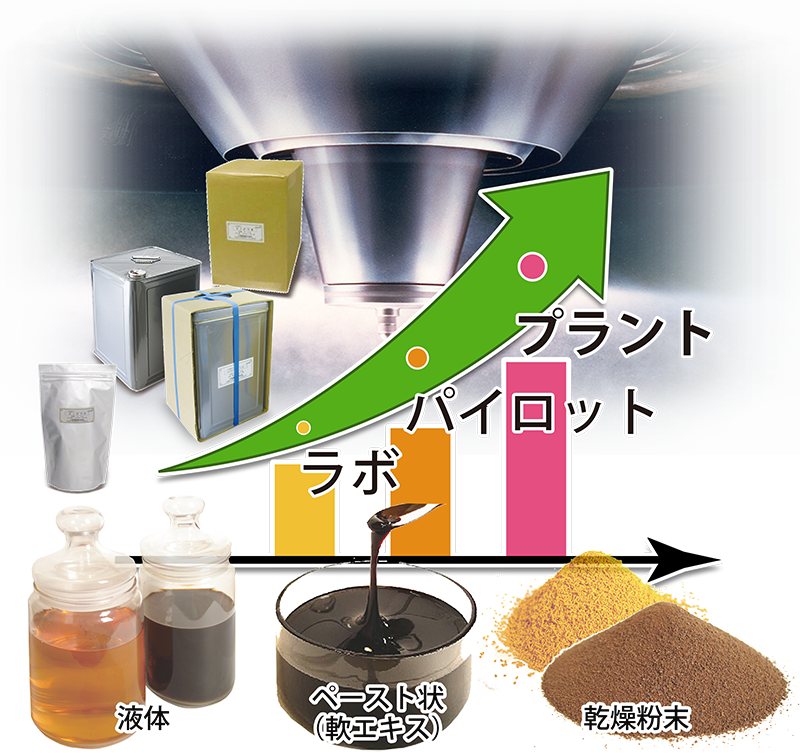 剤形は液体からペースト(軟エキス)、乾燥粉末など最終剤形に合わせた製品をご提供致します。ラボでの製法検討から、バリデーション後の商用化生産までスピーディーに対応致します。各生産ラインは少量から大量まで対応可能で、コスト低減を考慮した効率的な生産方法をご提案します。