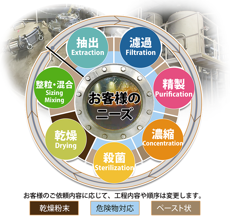 当社は天然物の抽出メーカーとして長年培ってきた経験と最新鋭の生産設備を活かして、幅広い受託加工事業を展開しています。 原材料の特性やご要望の製品スペックに応じて最適な製造方法をご提案するとともに、医薬品GMP、HACCPに対応した生産工場で高品質な製品をお届けします。
