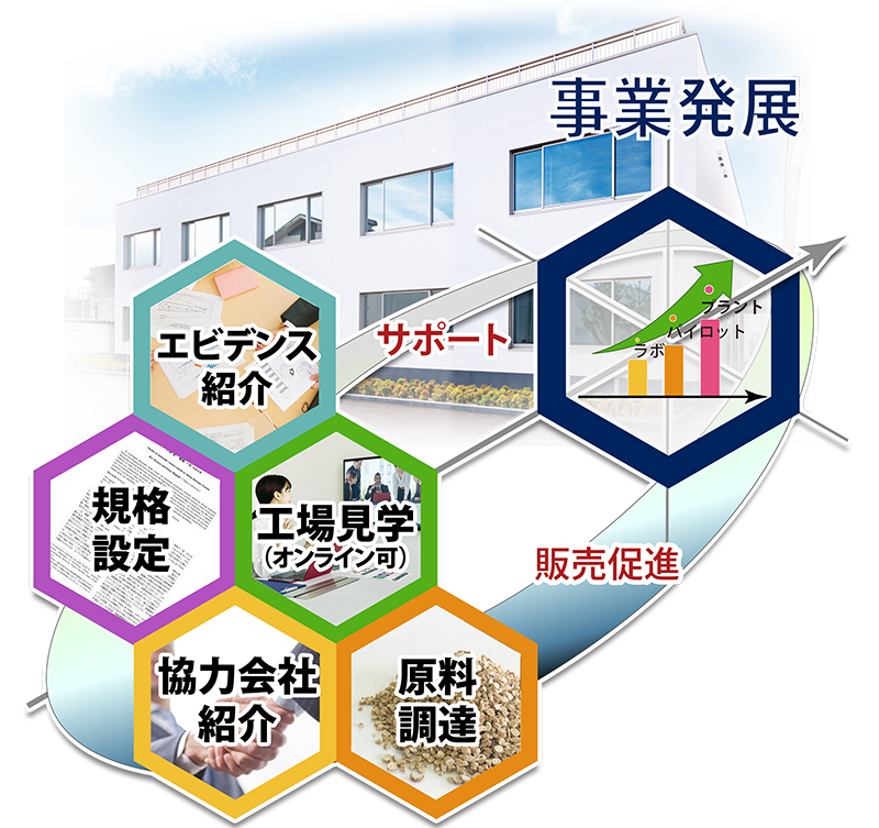 お客様に安心してお任せ頂けるように、当社の工場見学(オンライン可)を積極的におすすめしております。また、エビデンスのご紹介など販売促進に役立つサポートや、原材料の調達や関連する協力会社のご紹介など、お客様の事業発展にご協力致します。